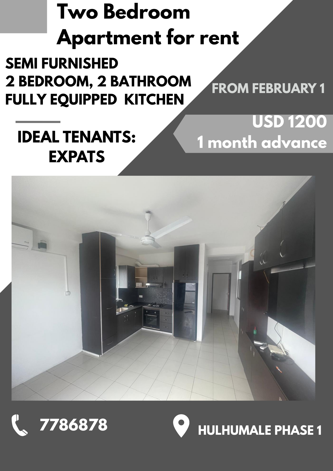 2 bedroom, semi furnished apartment in Hulhumale phase 1.
